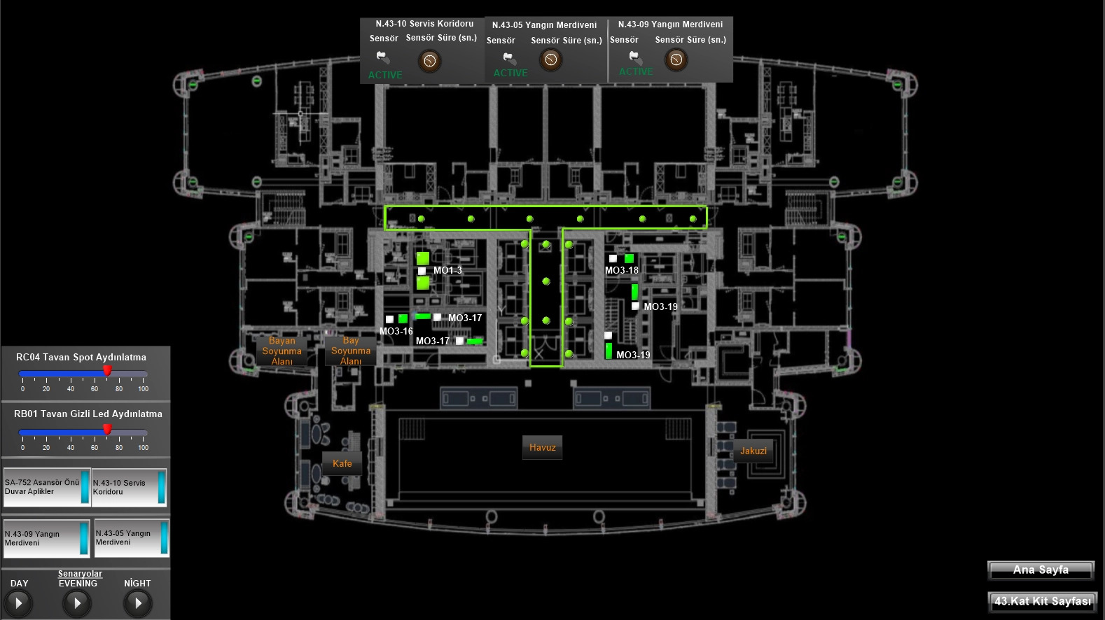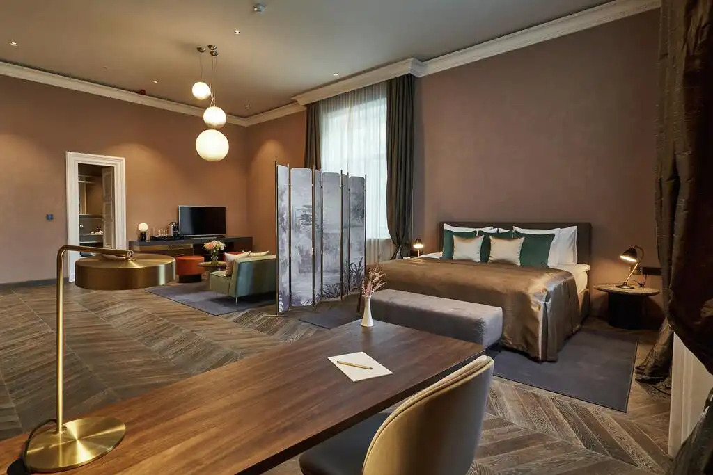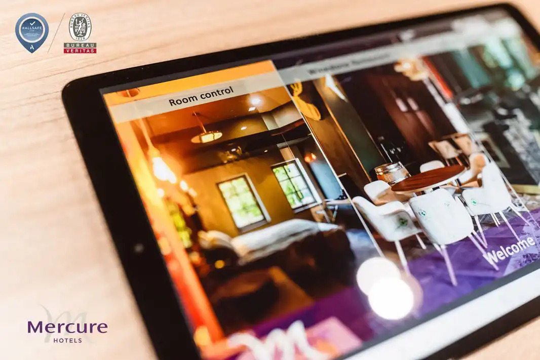 The project integrates comfort, luxury, and energy efficiency with a KNX system and BMS. Guest rooms feature advanced automation for lighting, curtains, temperature, air flow, and DND/MUR, all controlled via Samsung tablets providing system access and guest information. Presence sensors automate temperature and ventilation adjustments based on occupancy.