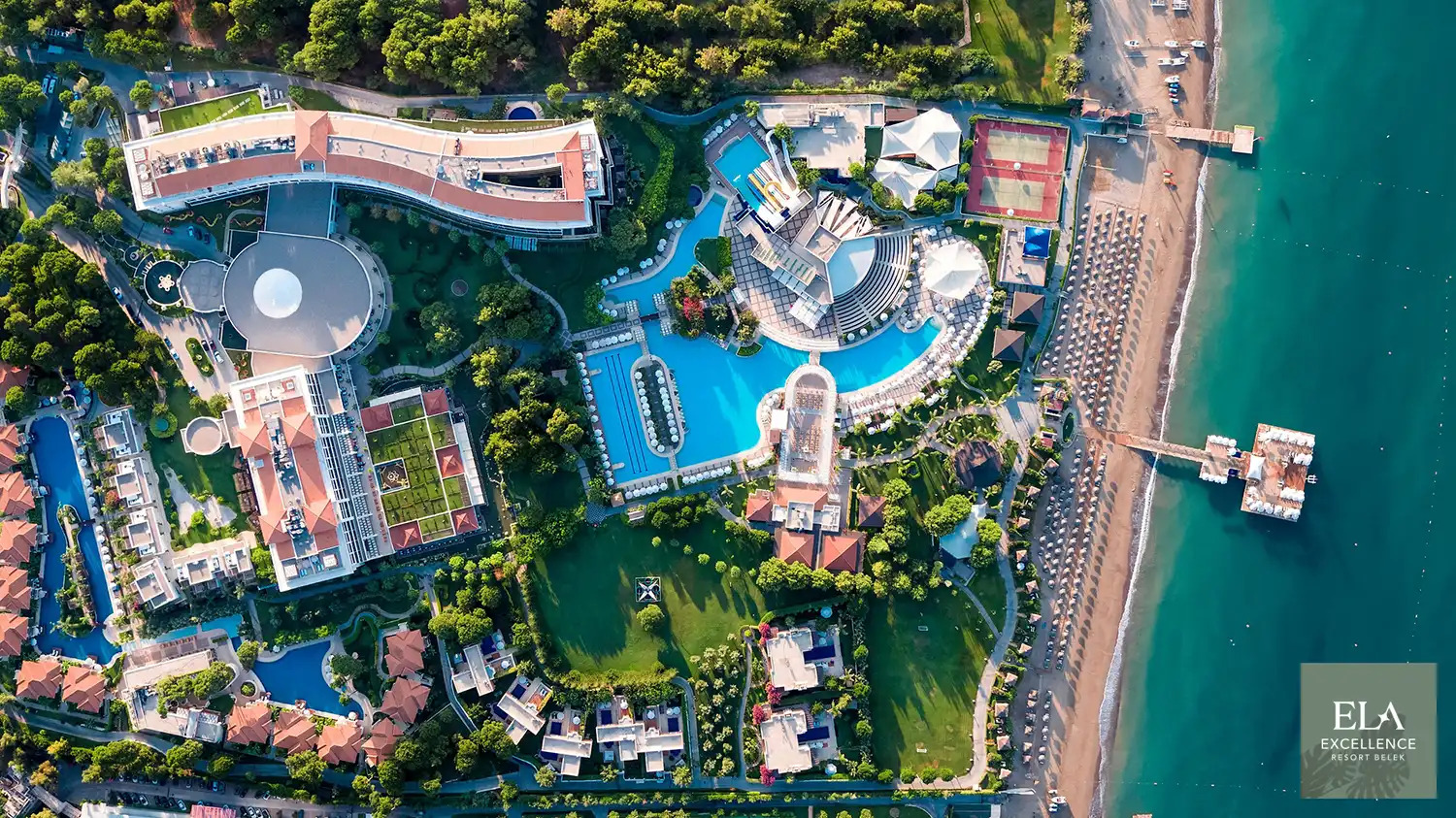 The resort in Belek features 15 golf courses, a 270 m² beach, a 1,100 m² pier, 110,000 m² of green space, and a total of 653 rooms, including 18 room and villa types spread across two main buildings and 26 villas.