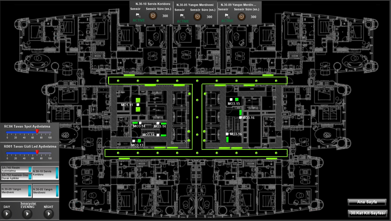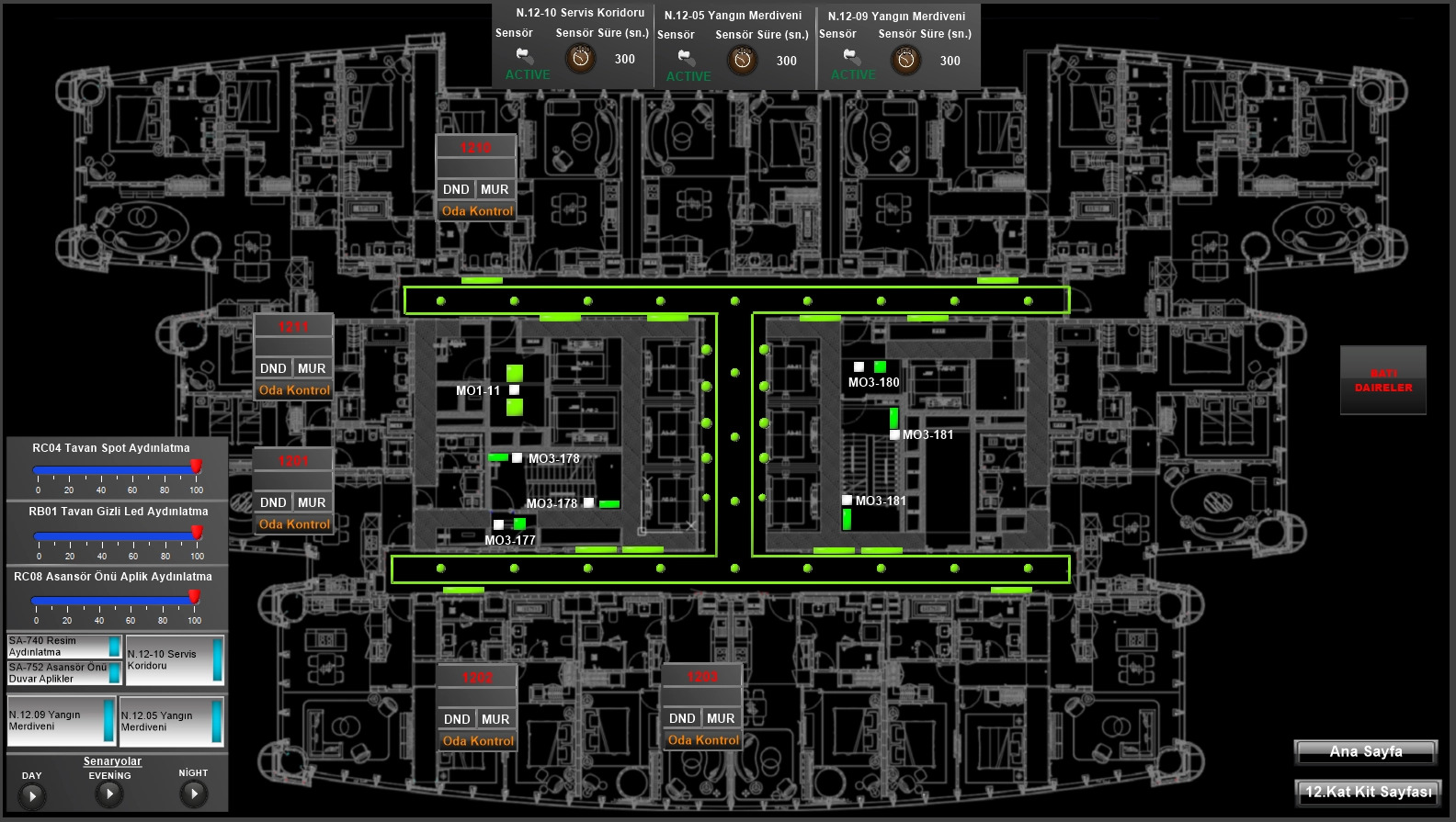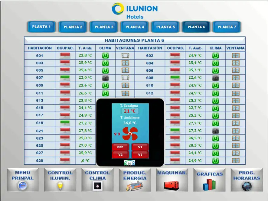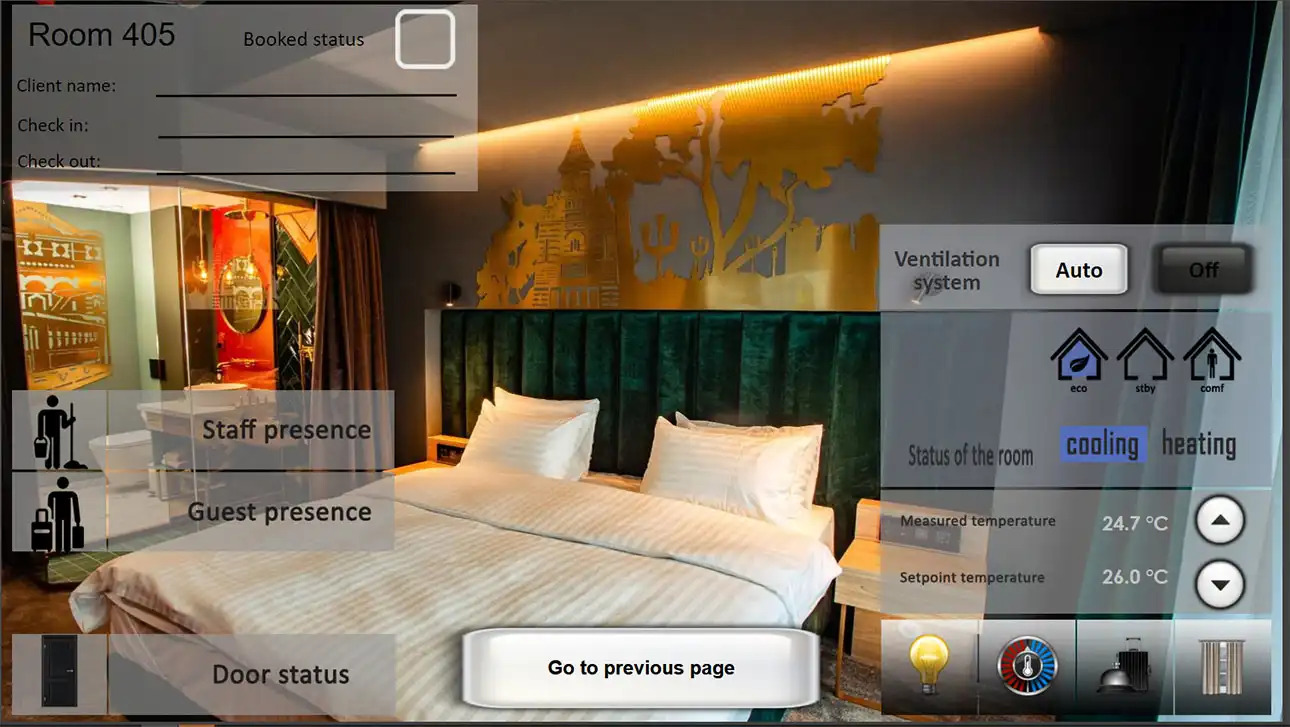 - KNX Guest Room Management System for light dimming/switching, blind control, air conditioning control, KNX dual technology motion sensors and scene recall