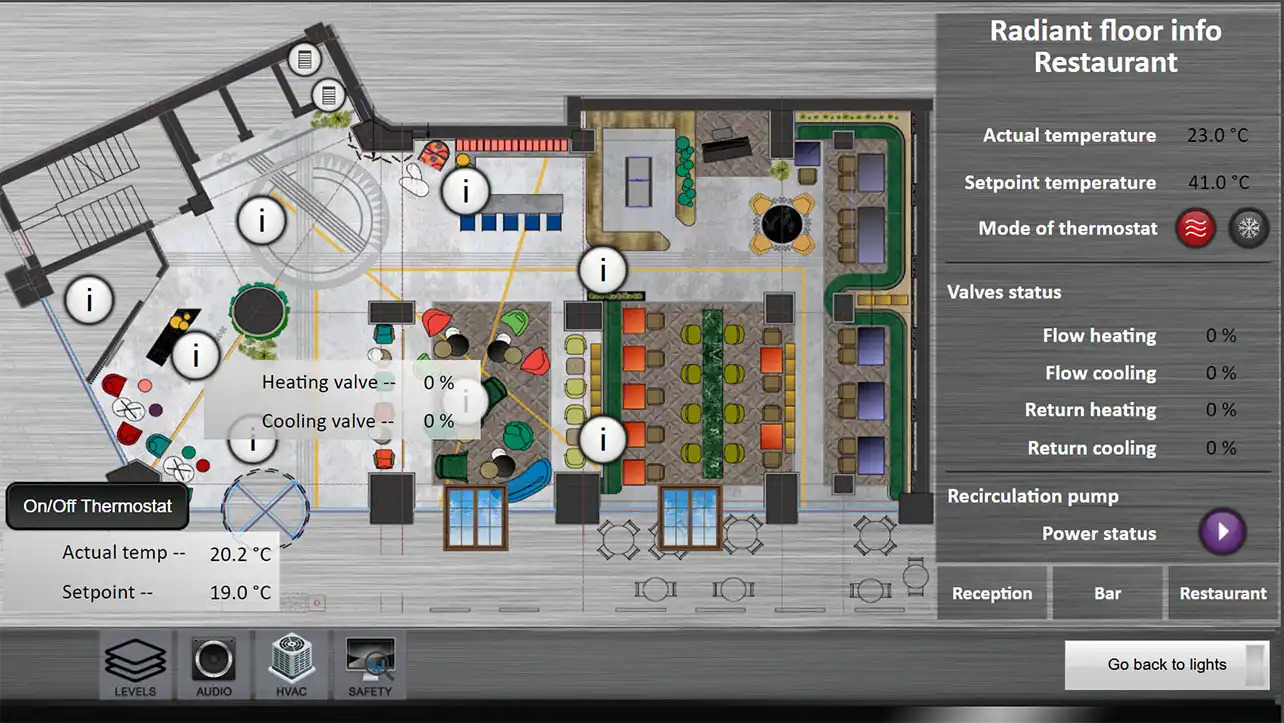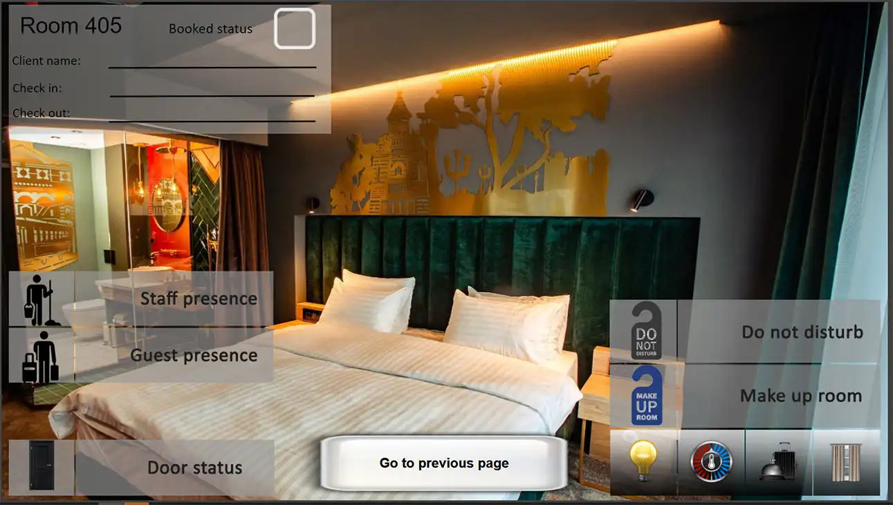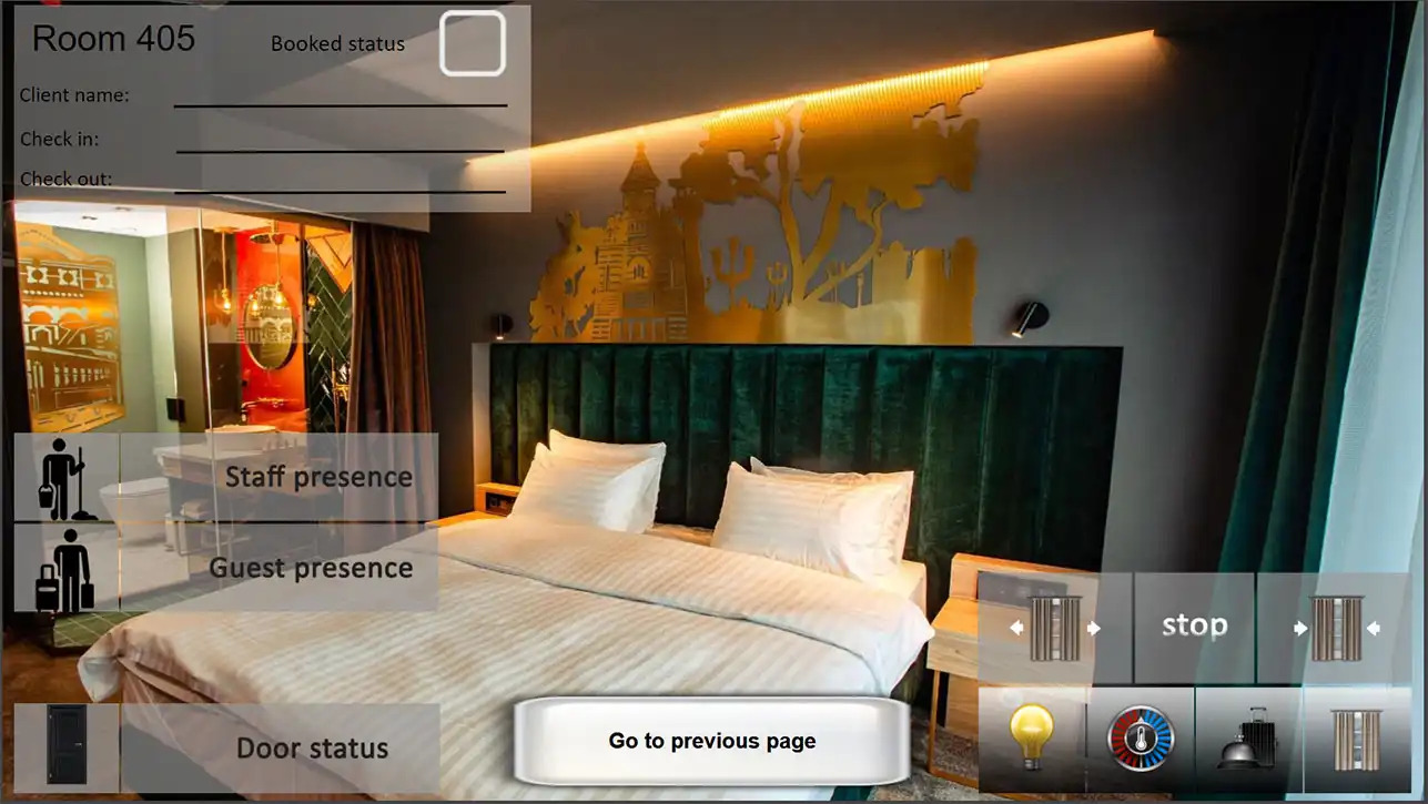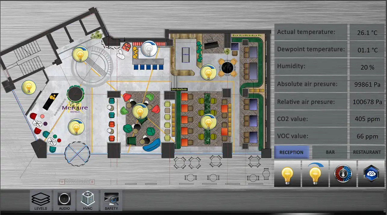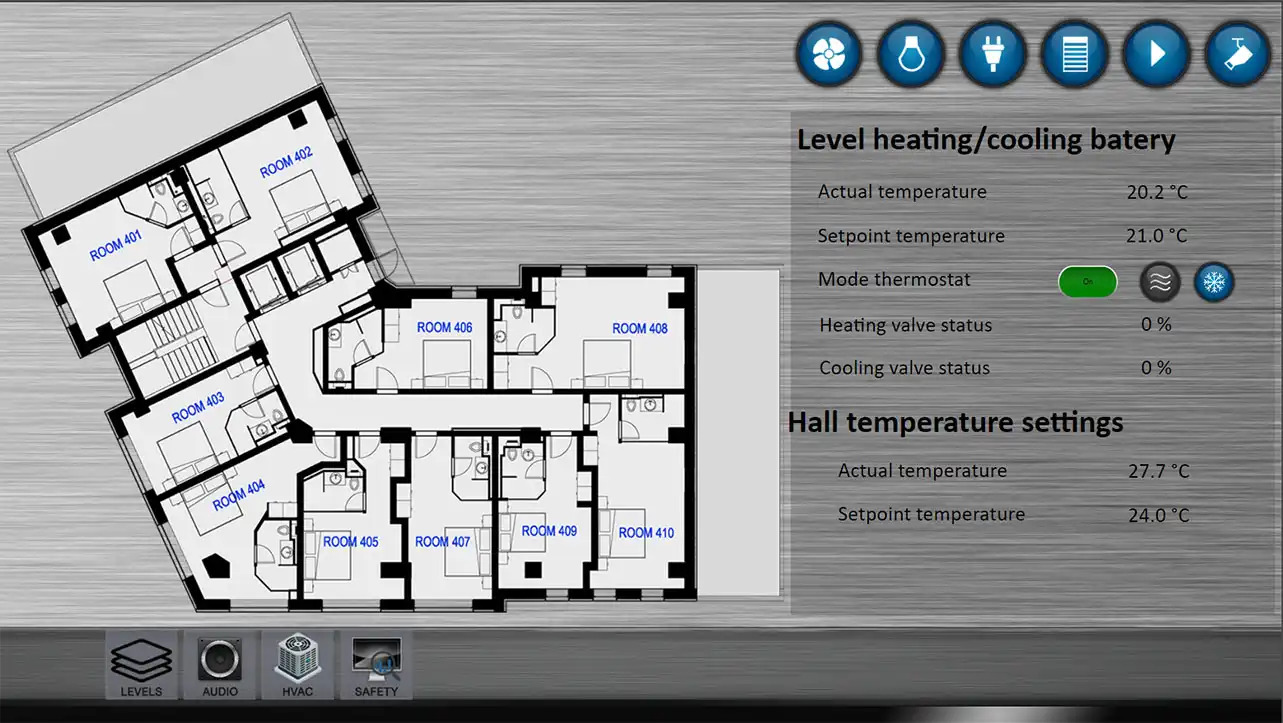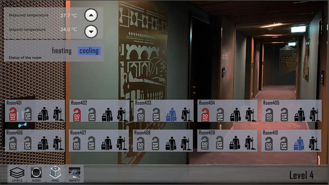 - Visualization: 3 types of visualization - 5 clients with full system, 60 for guest rooms and 10 for staff with different rights