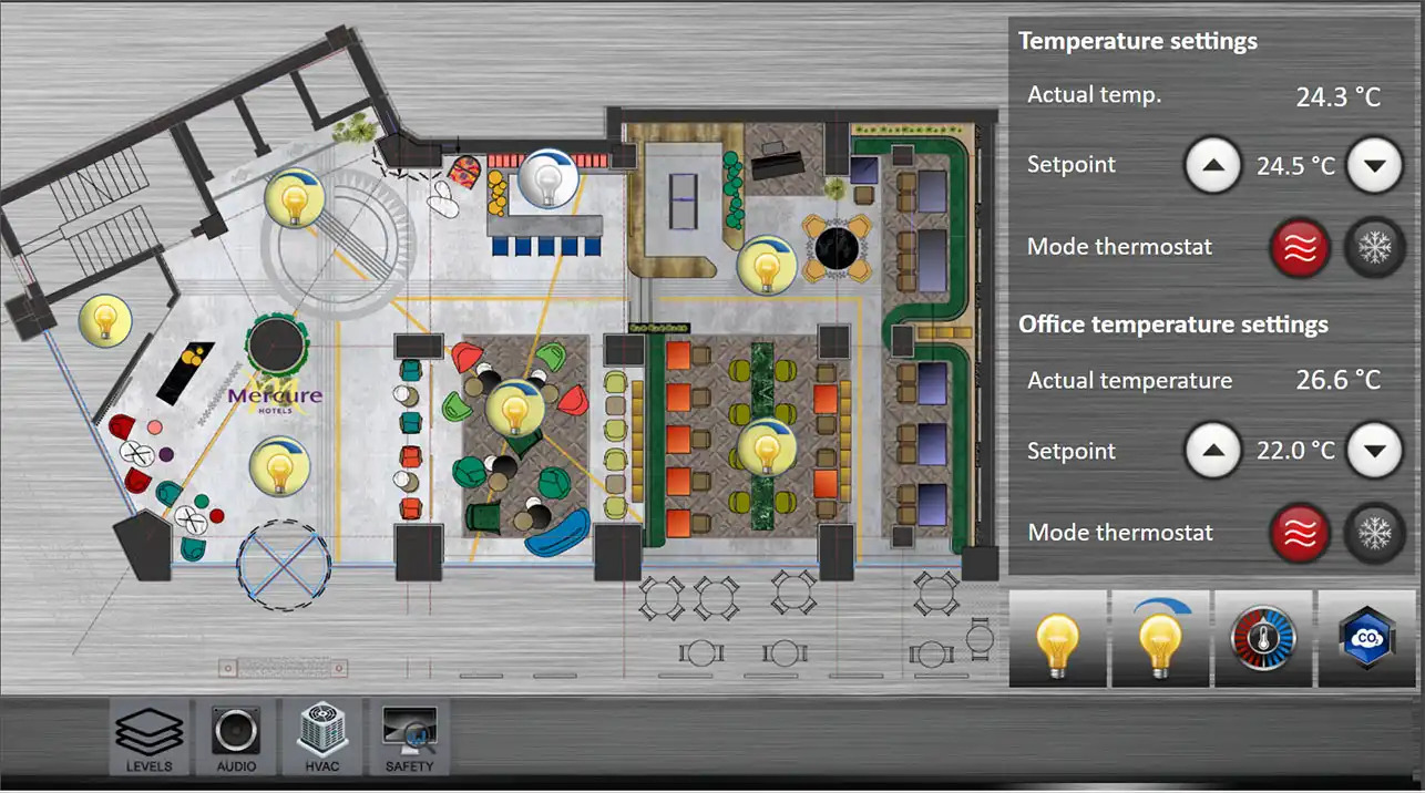 Common areas, including the lobby, meeting rooms, restaurant, and bar, use KNX multisensors for monitoring and advanced systems like DALI lighting, DMX RGB lighting, and a multiroom audio system. The BMS ensures centralized control, visualization, and fault detection for efficient operation.