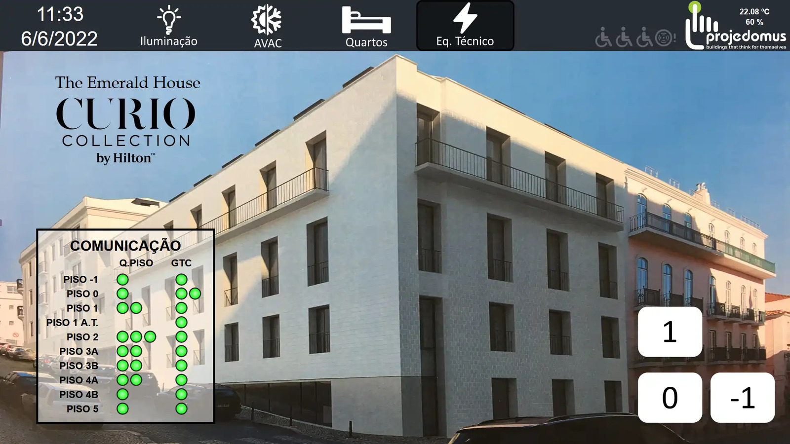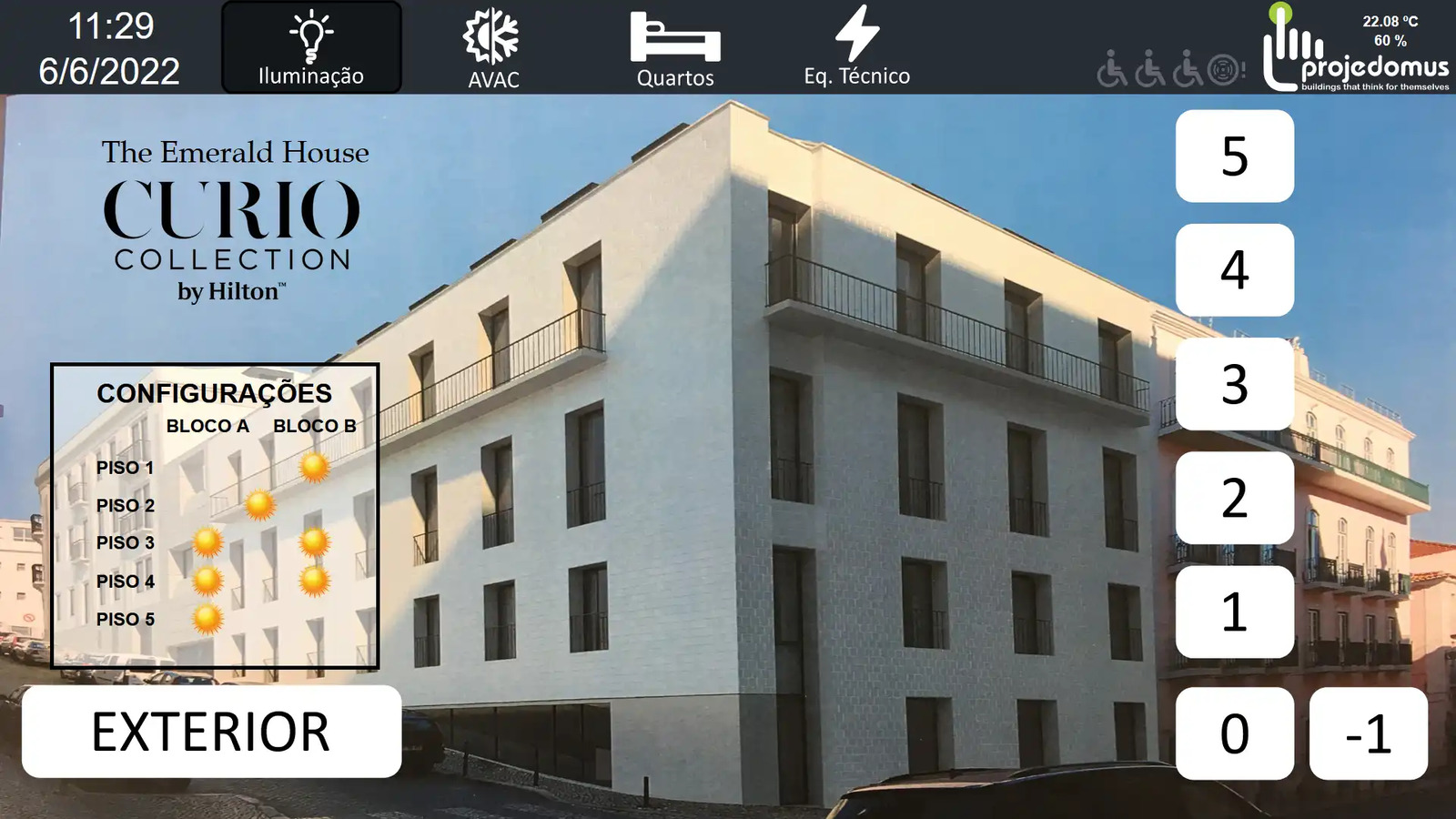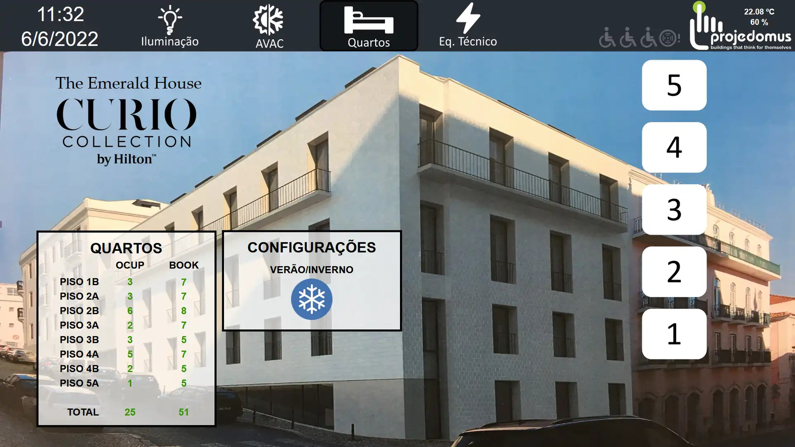 The Emerald House is the first Curio Collection hotel in Portugal, built by Hilton. Located on Rua das Janelas Verdes in one of Lisbon’s most iconic historic neighborhoods, it offers a warm, homely atmosphere inspired by Portuguese hospitality. Projedomus managed the control systems for lighting, shutters, HVAC, monitoring panels, thermal regulation, and technical alarms, both indoors and outdoors. Room scenarios are integrated with the hotel management system to enhance guest comfort and optimize energy use. All systems are fully integrated and controlled via a user-friendly interface. The setup is scalable and compatible with various building communication protocols.