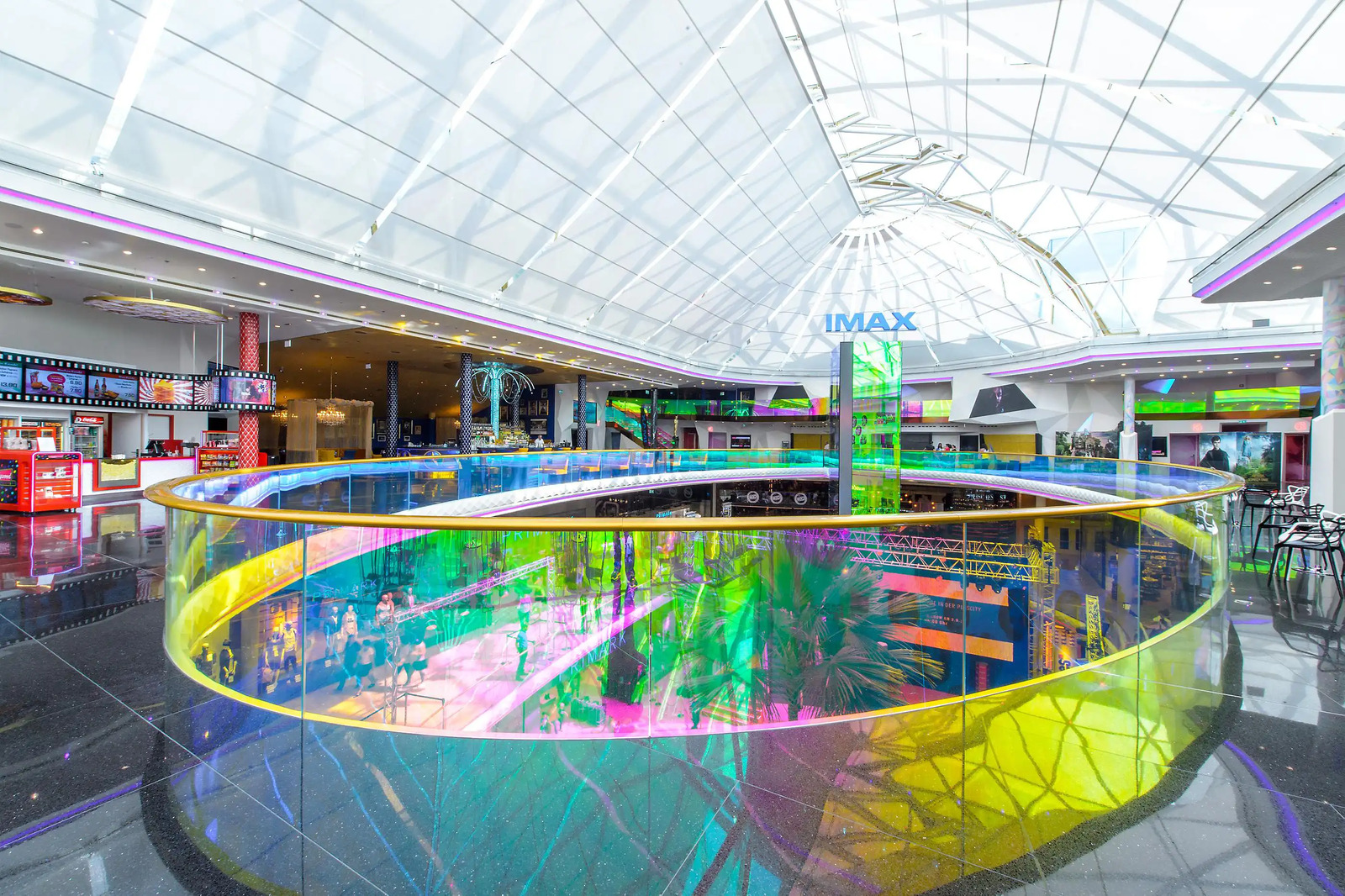 The NETx BMS Server integrates KNX, DALI, and DMX for central lighting control, enabling daylight-adaptive lighting and optimizing parking deck energy use. In the Hollywood Megaplex, it combines lighting control with cash desk and building systems for automated operations.