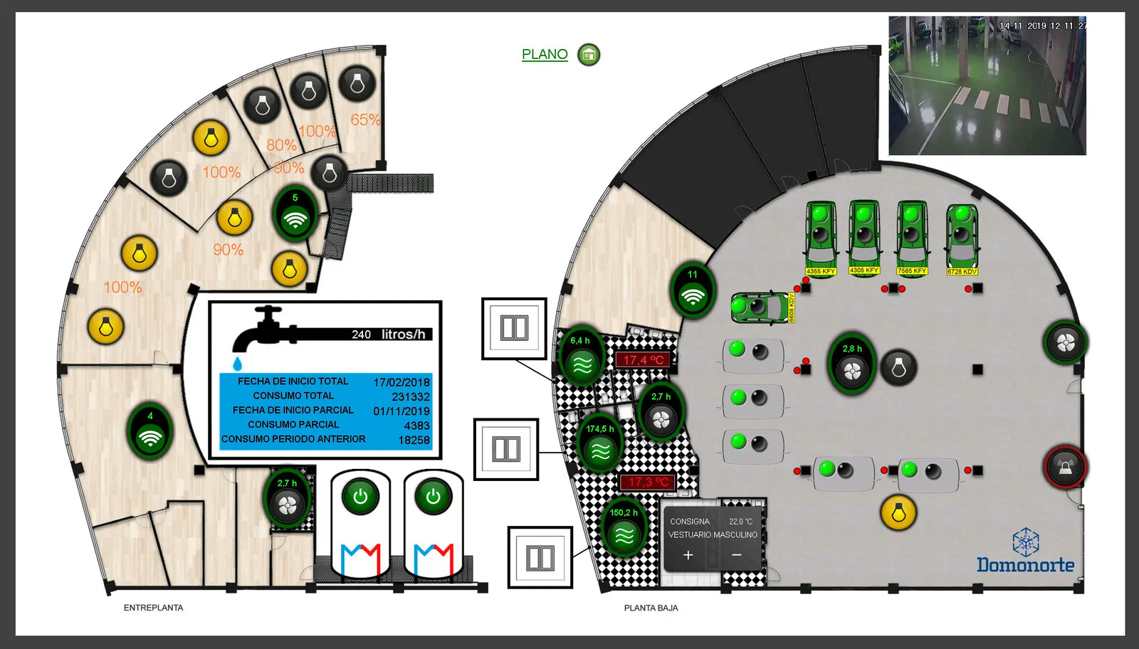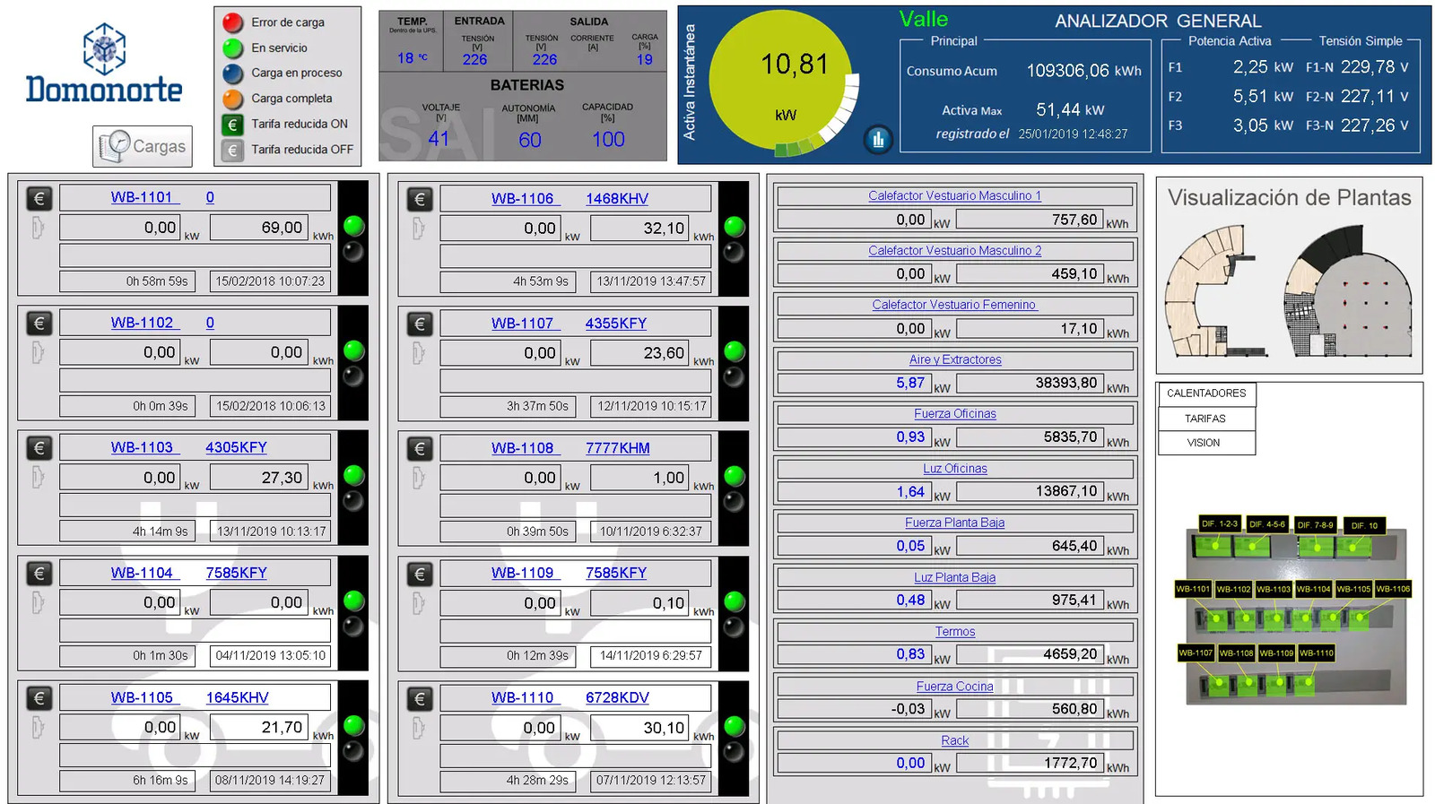 A cleaning company in Bilbao manages eight electric vehicles with limited power availability. Charging is controlled via RFID readers, and the intensity of each outlet is managed. General consumption, charging circuits, plugs, lighting, HVAC, and water usage are monitored. Office lighting activates only when brightness falls below a threshold, while locker room heaters maintain a uniform temperature during shower times and shut off when windows are open. Ventilation and thermoses are disabled during vehicle charging.
